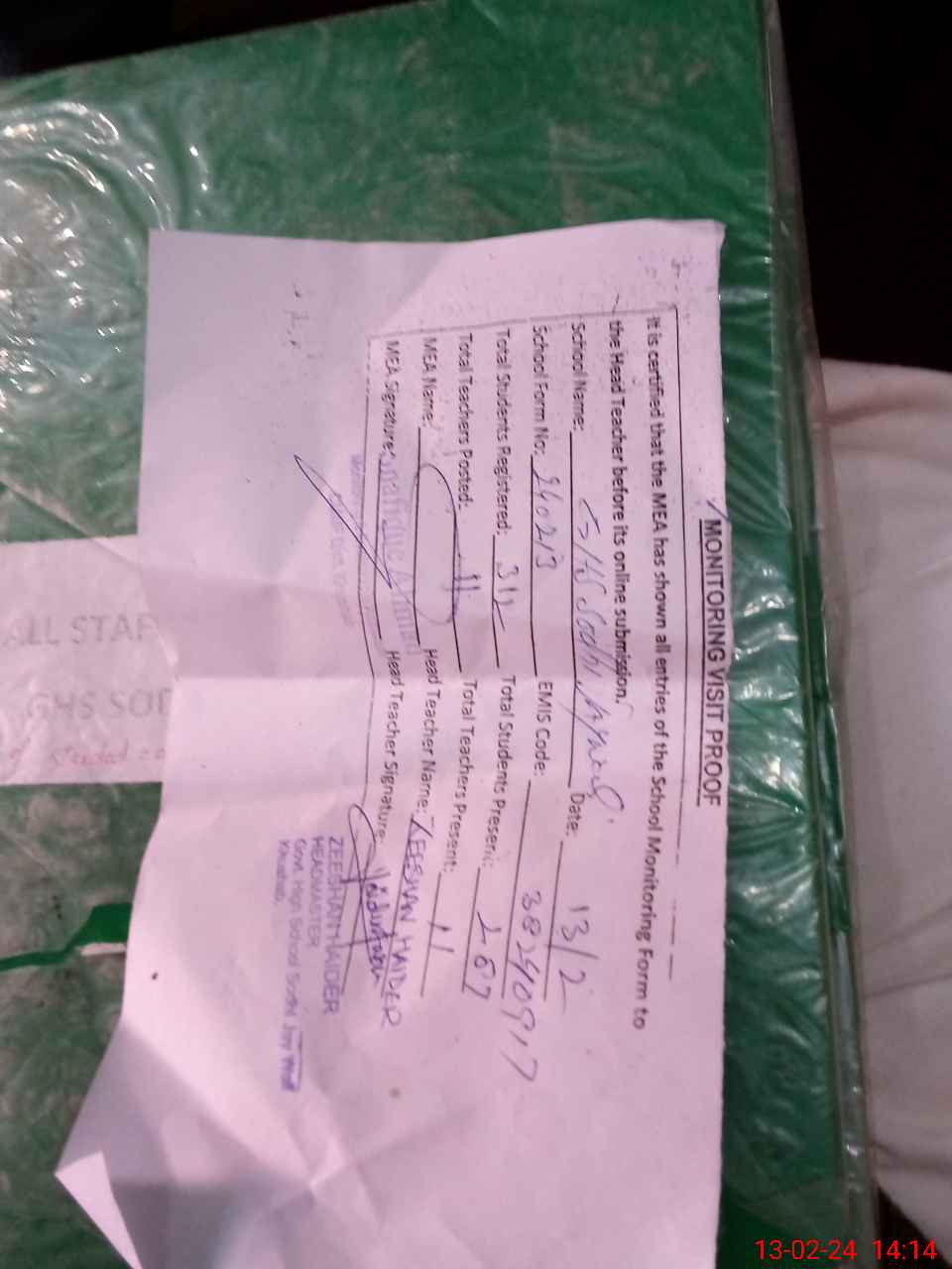 | Attendance Register | Head Teacher | MEA with School | Visit Proof |