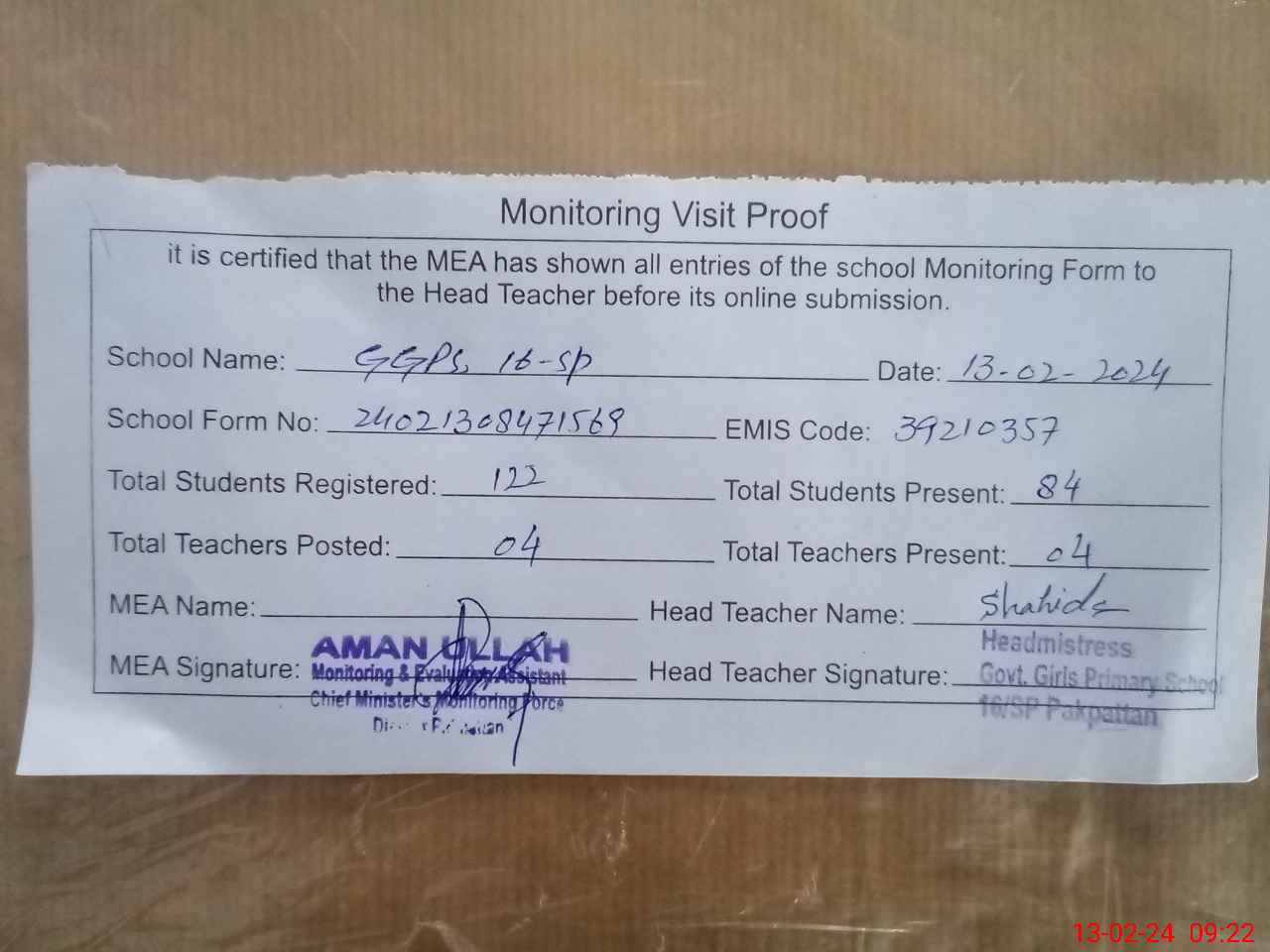 | Attendance Register | Head Teacher | MEA with School | Visit Proof |
