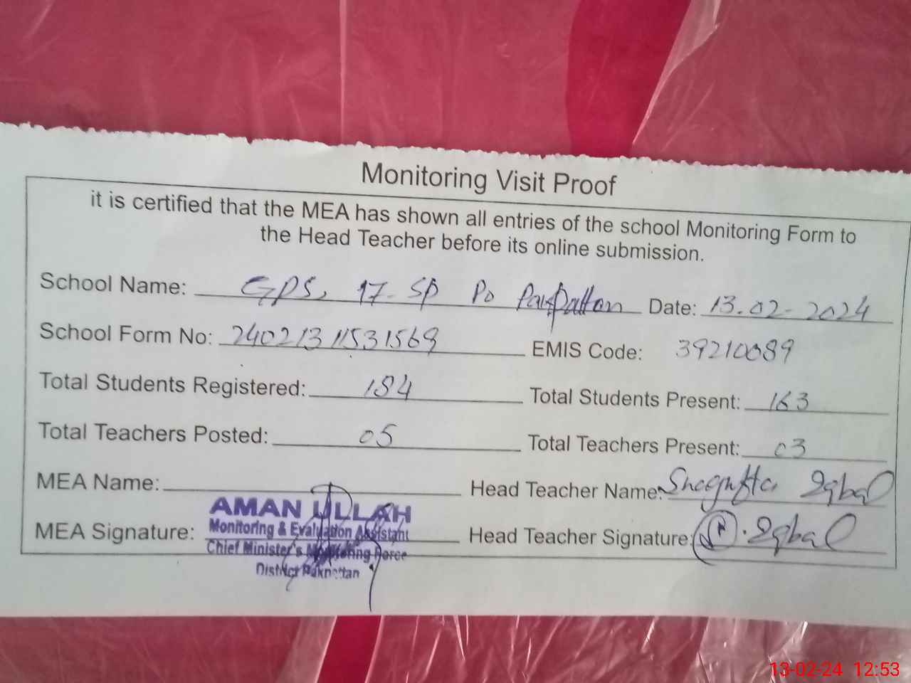 | Attendance Register | Head Teacher | MEA with School | Visit Proof |