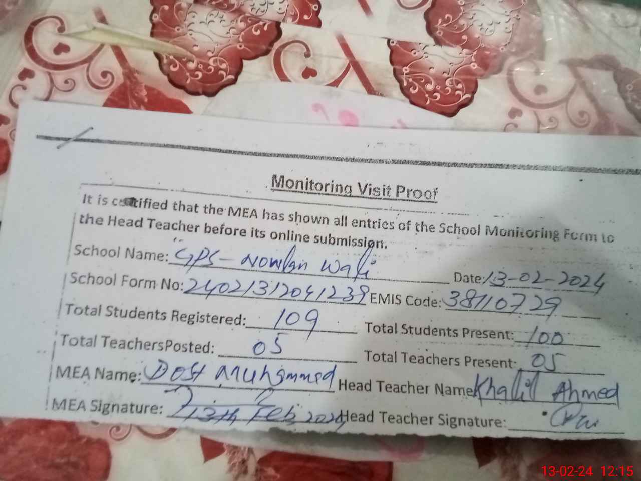 | EMIS Code: 38110729 | Name of School: GPS NOWLAN WALI | |||