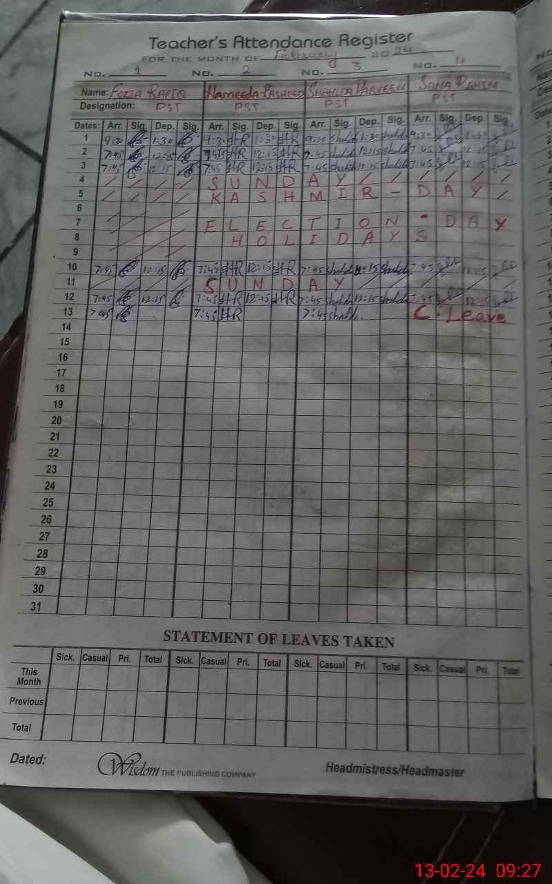 | CNIC | Full Name | Designation | R/C | Absence During Last Calender Month |