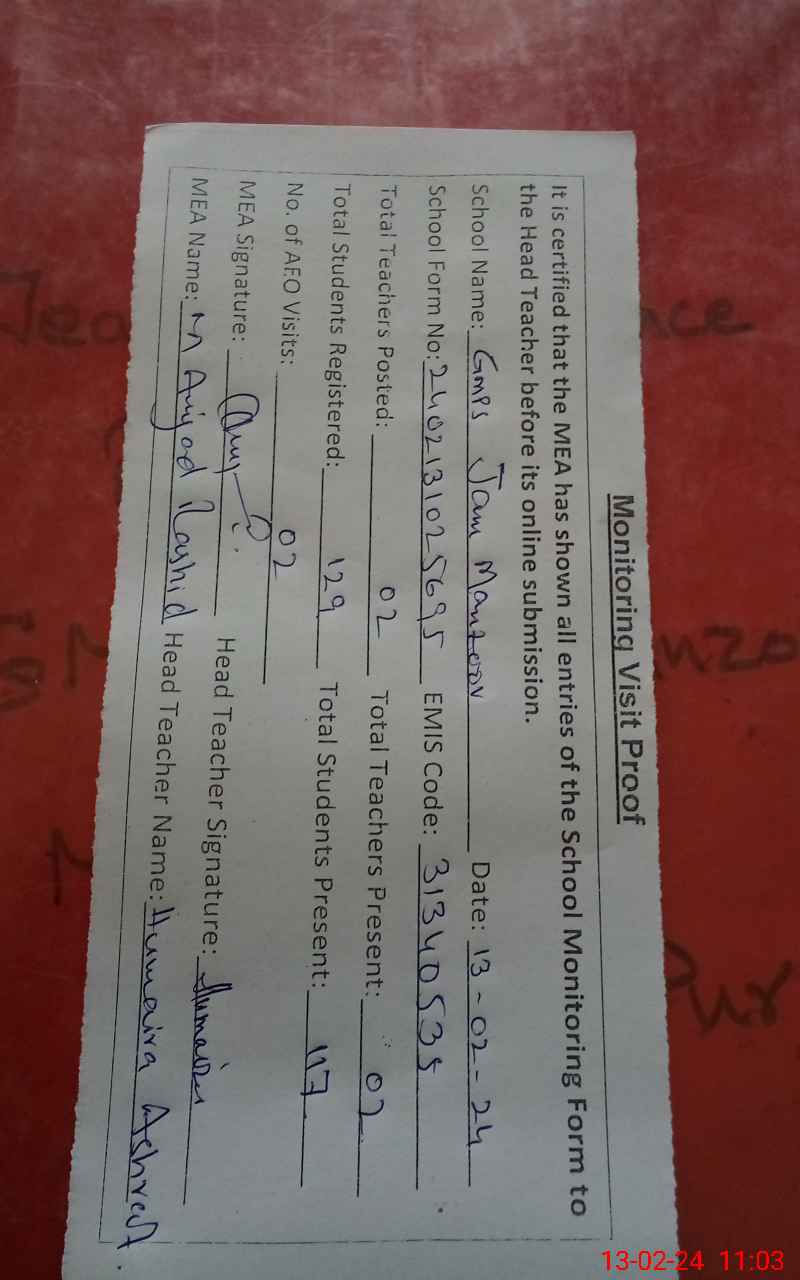 | EMIS Code: 31340535 | Name of School: GMPS JAM MANZOOR | |||