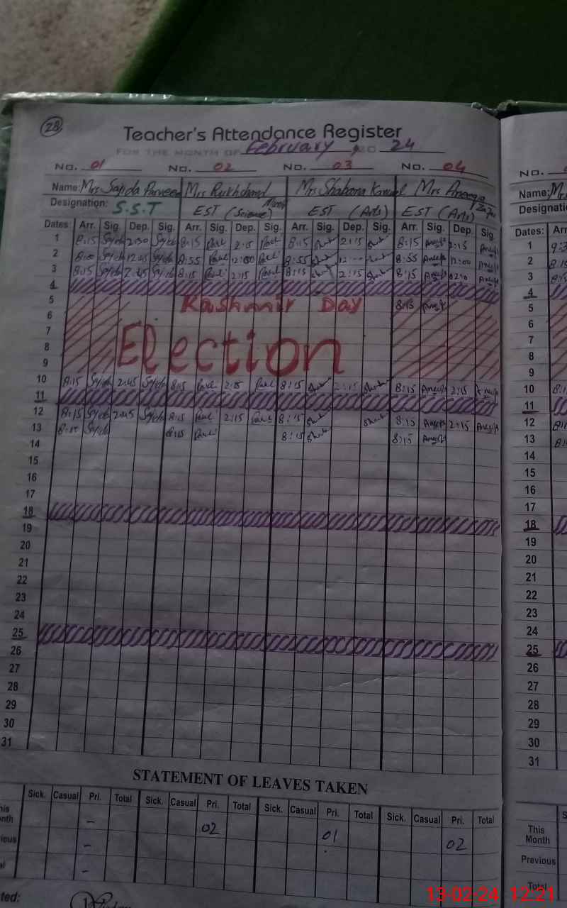 | No. of Students Present - Female | 29 | 0 | 75 | 40 | 33 | 20 | 18 | 19 | 19 | 16 | 18 | 287 | ||||