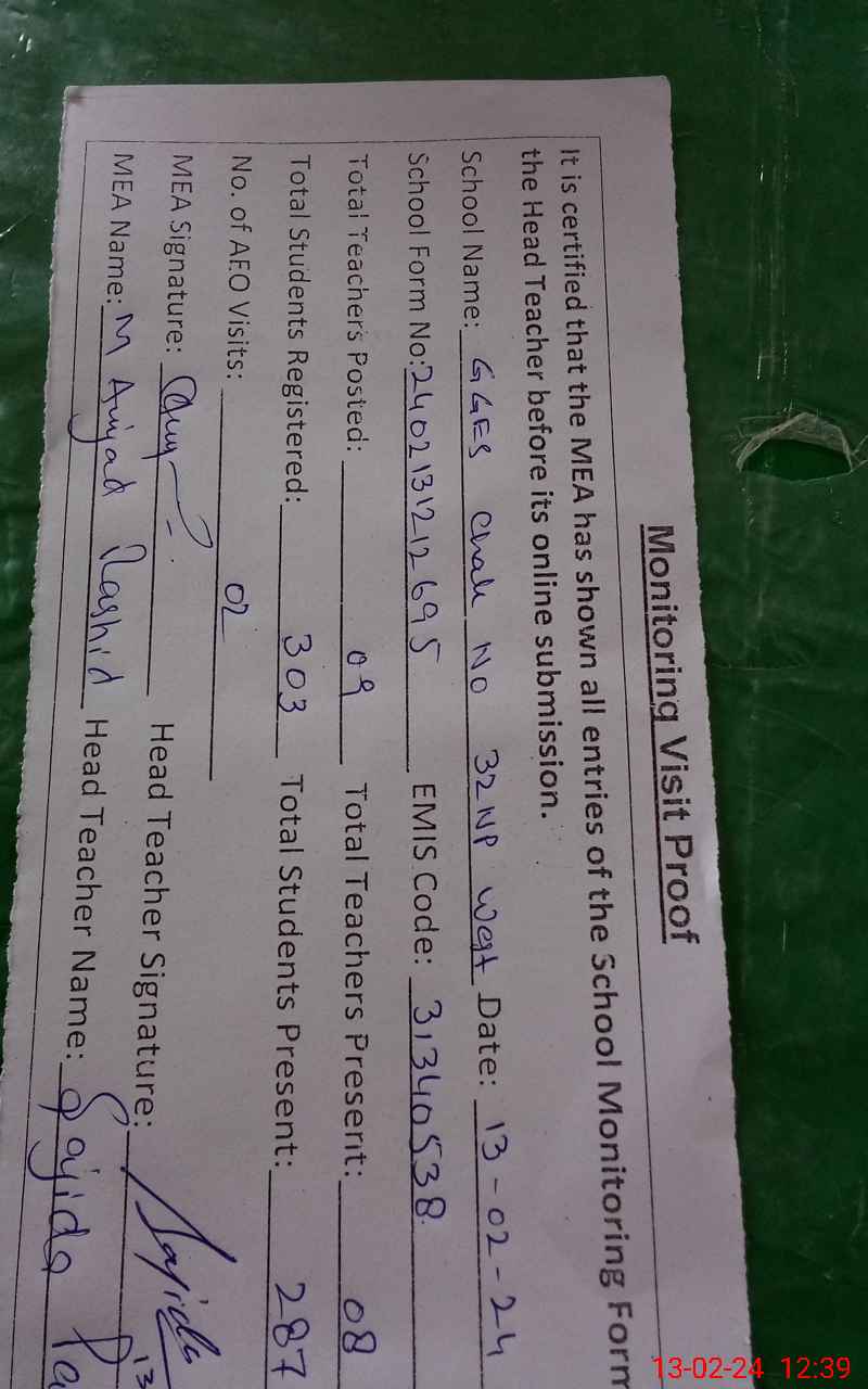 | Certified that this School was Inspected by the Undersigned MEA/DMO Today and the Information Stated Above is as Per Record. | |||||