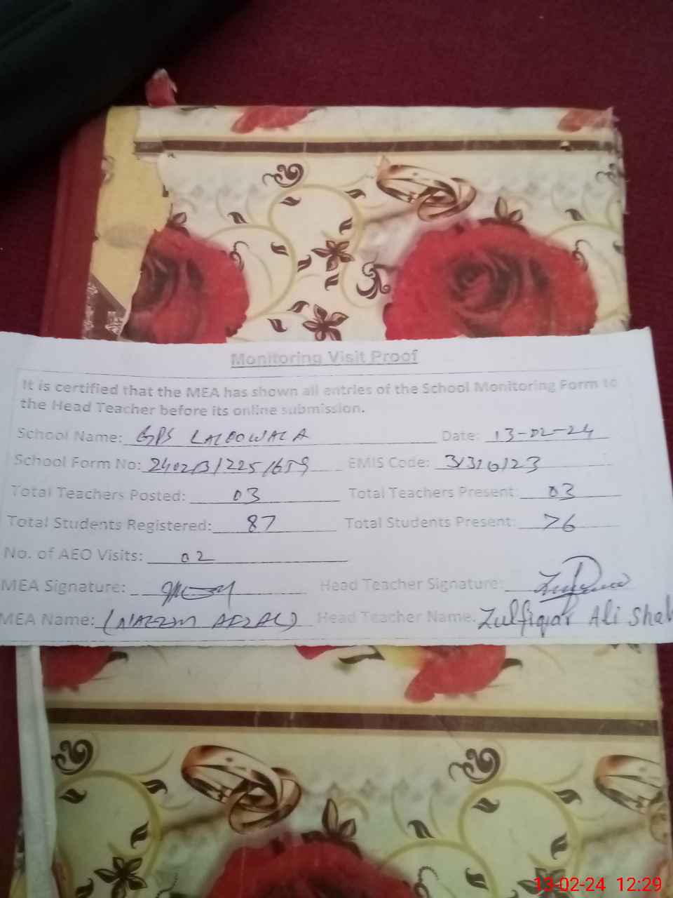 | Attendance Register | Head Teacher | MEA with School | Visit Proof |