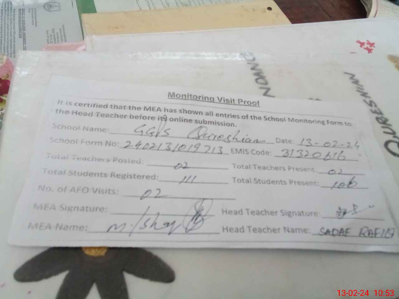 | Attendance Register | Head Teacher | MEA with School | Visit Proof |