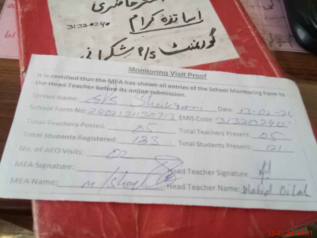 | Attendance Register | Head Teacher | MEA with School | Visit Proof |