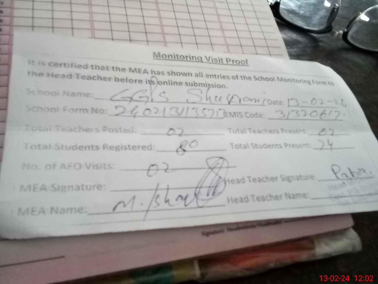 | Attendance Register | Head Teacher | MEA with School | Visit Proof |