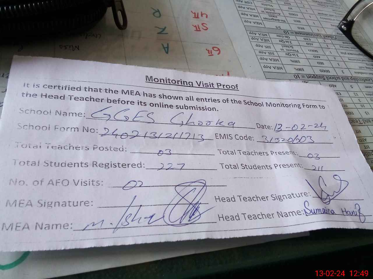 | Attendance Register | Head Teacher | MEA with School | Visit Proof |