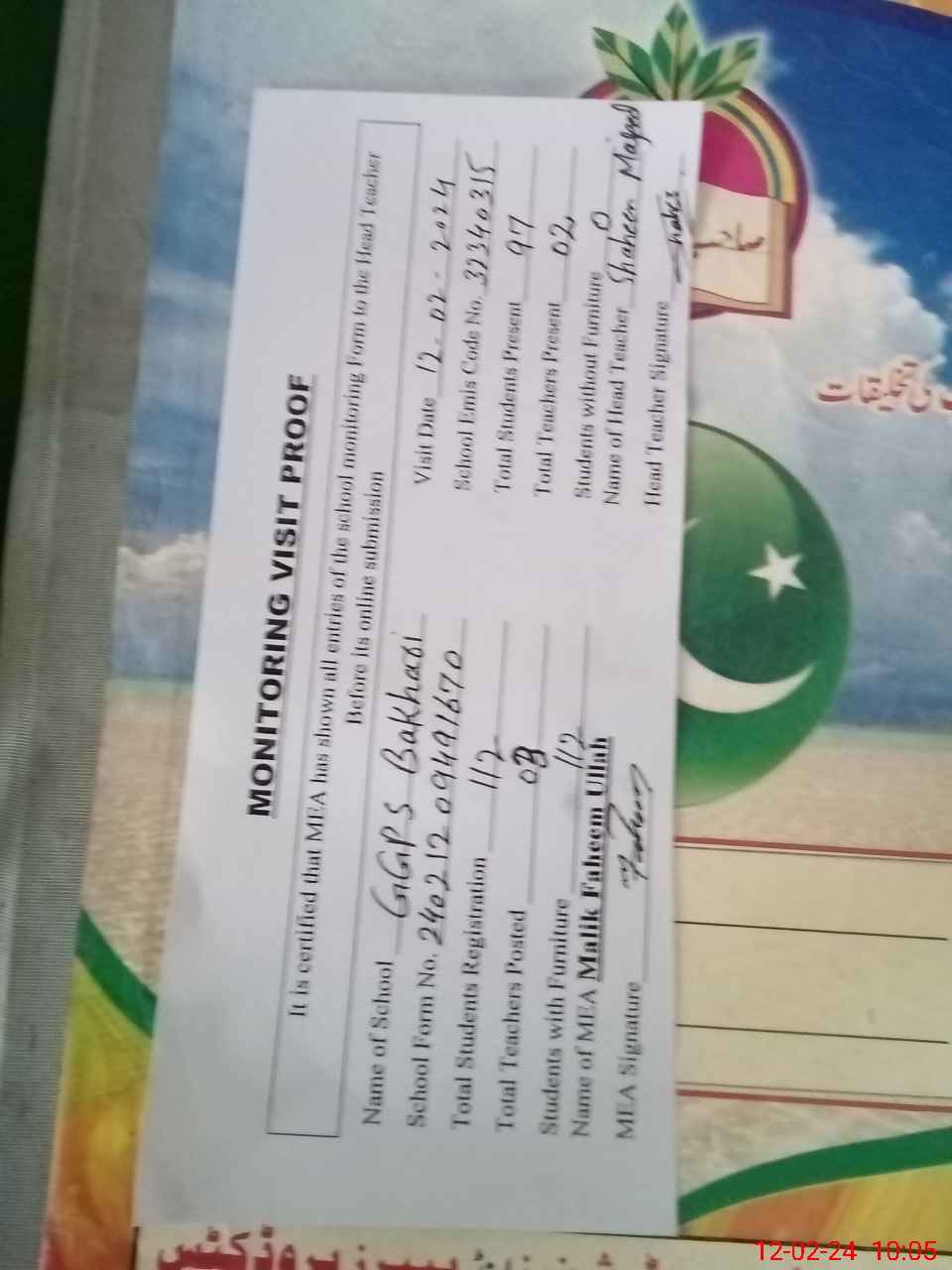 | Attendance Register | Head Teacher | MEA with School | Visit Proof |
