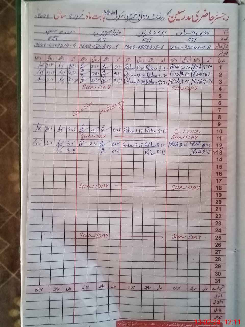 | CNIC | Full Name | Designation | R/C | Absence During Last Calender Month |