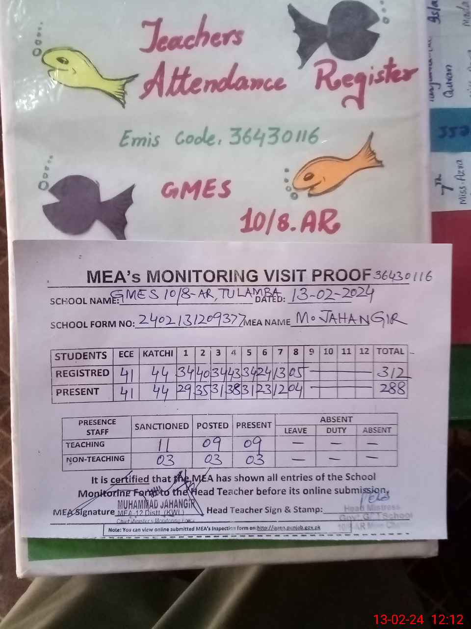| Attendance Register | Head Teacher | MEA with School | Visit Proof |