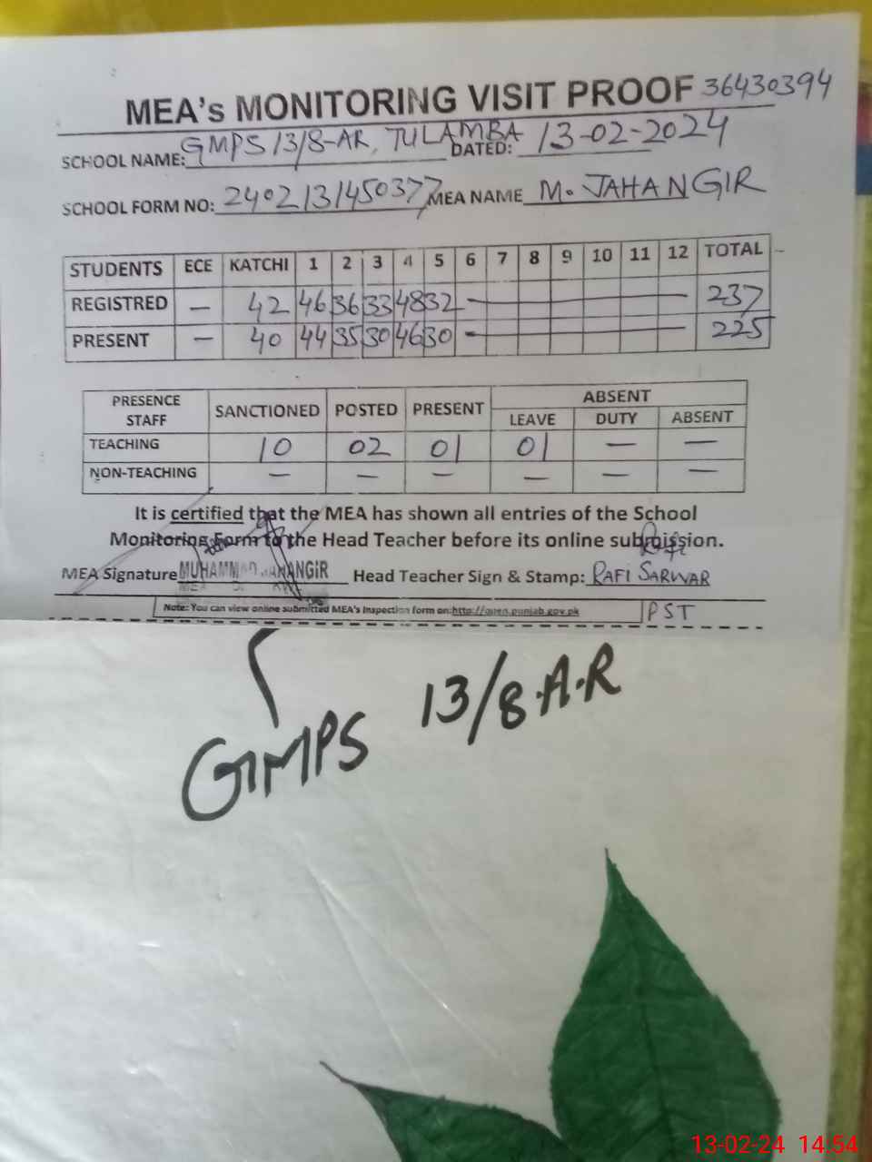 | EMIS Code: 36430394 | Name of School: GMPS 13/8-AR, P/O 20/8-R, TULAMBA | |||