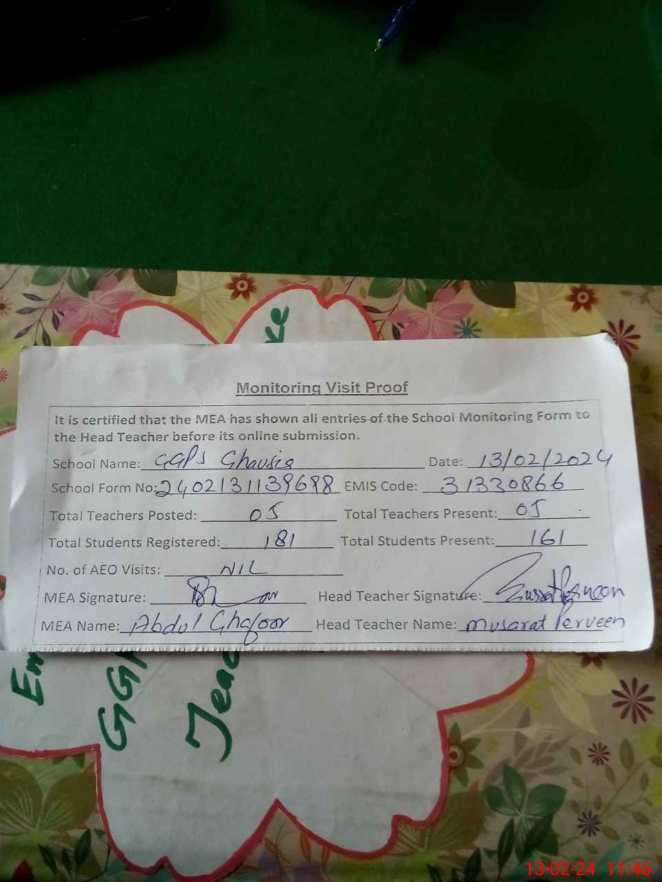 | Certified that this School was Inspected by the Undersigned MEA/DMO Today and the Information Stated Above is as Per Record. | |||||
