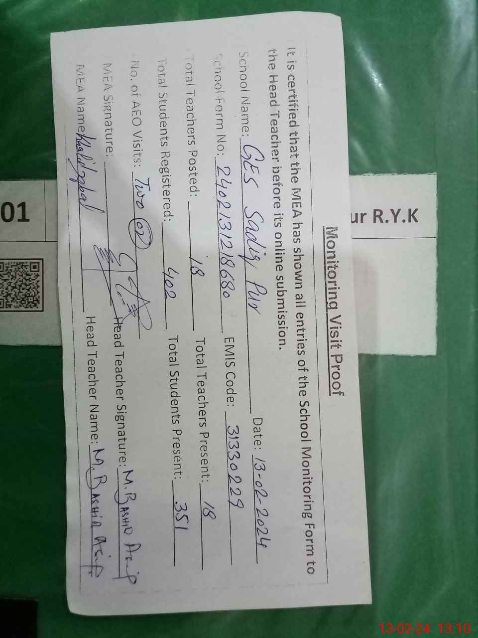 | EMIS Code: 31330229 | Name of School: GES SADIQ PUR | |||
