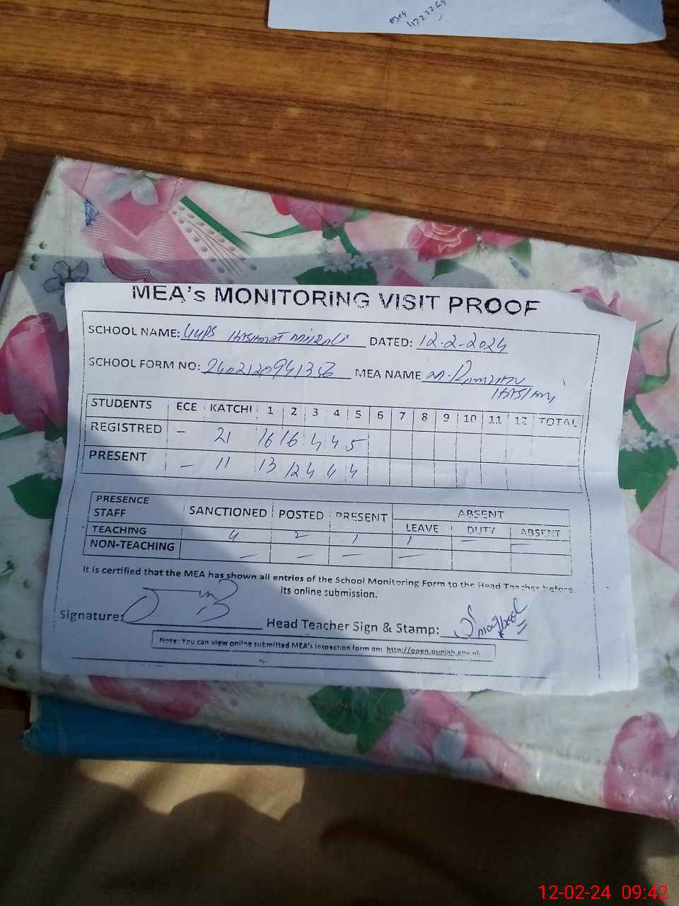 | Attendance Register | Head Teacher | MEA with School | Visit Proof |