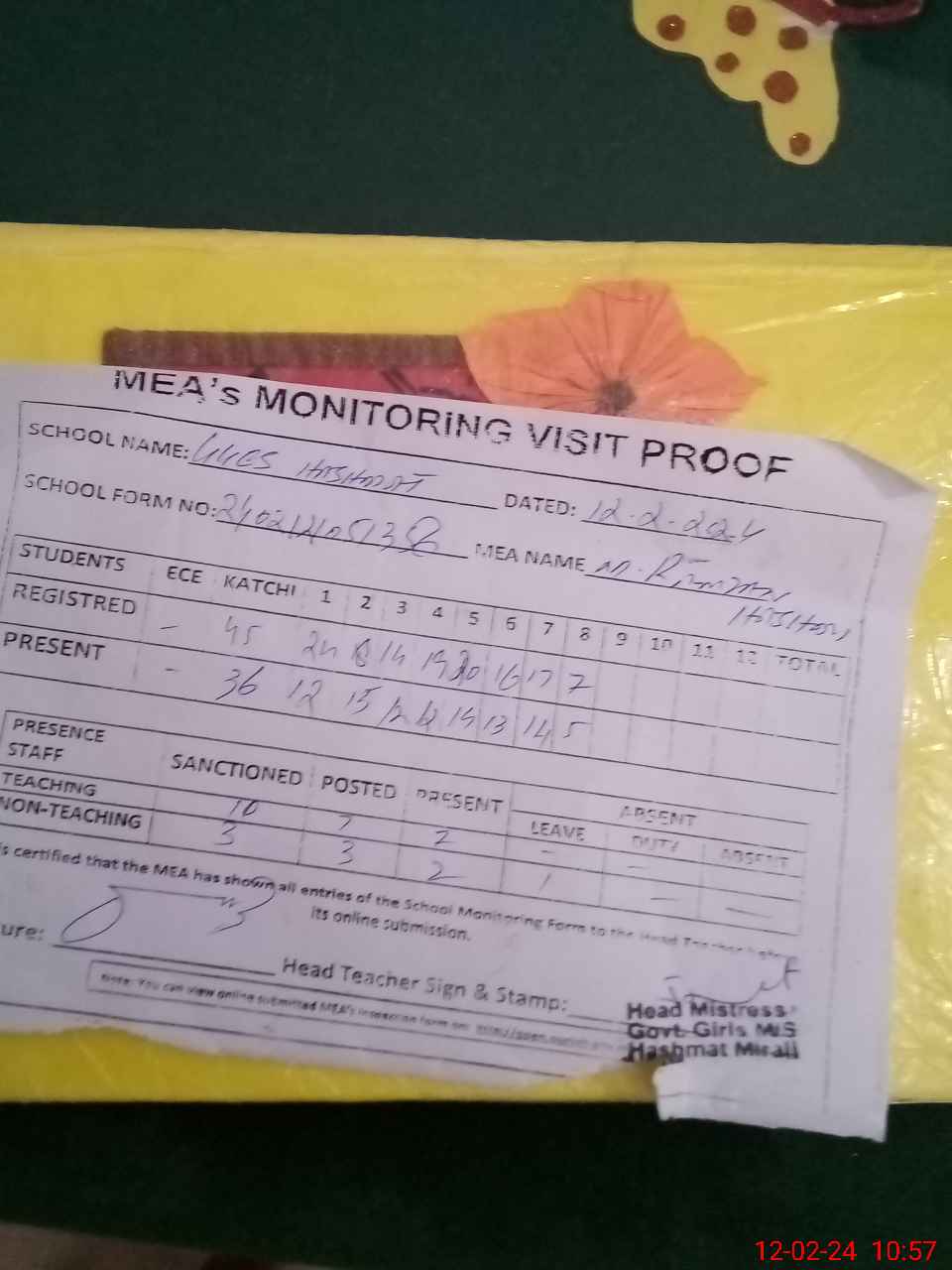 | Attendance Register | Head Teacher | MEA with School | Visit Proof |