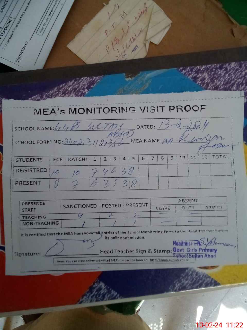 | Attendance Register | Head Teacher | MEA with School | Visit Proof |