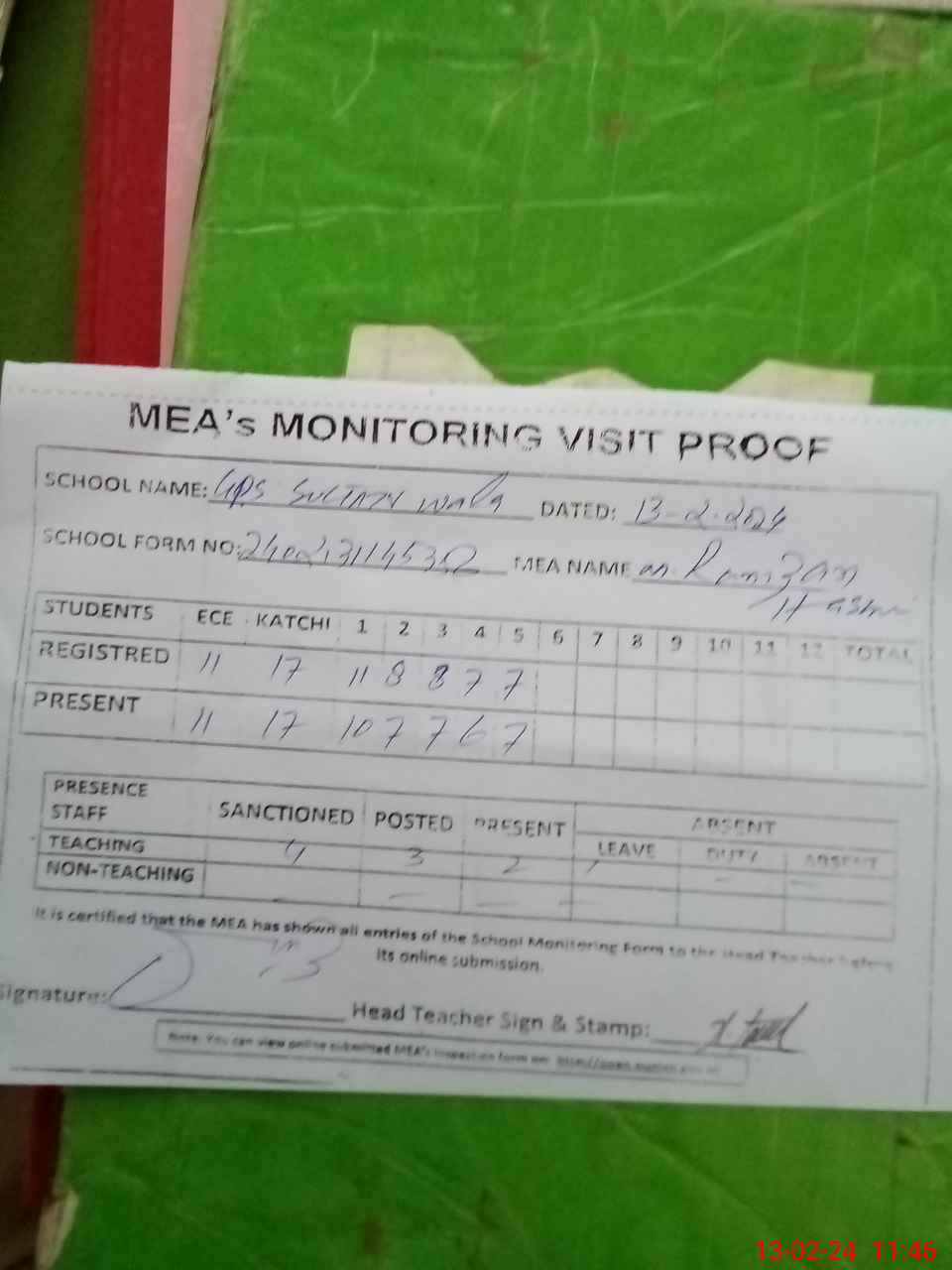 | Attendance Register | Head Teacher | MEA with School | Visit Proof |