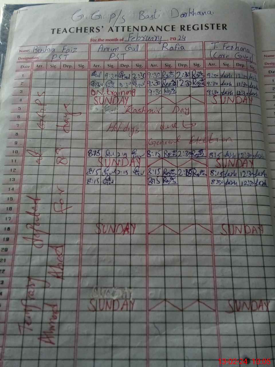 | Remarks (Use Separate Page if Required): Bad taste of drinking water Height of boundary wall is low Head teacher Bushra Faiz is temporary attached with GGPS Ahmedabad since 31 August 2023 on unknown reasons Only 01 teacher available at school | |||||