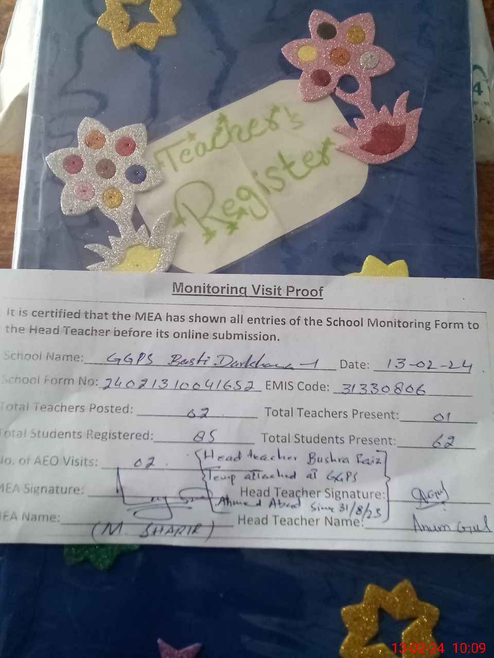 | Attendance Register | Head Teacher | MEA with School | Visit Proof |