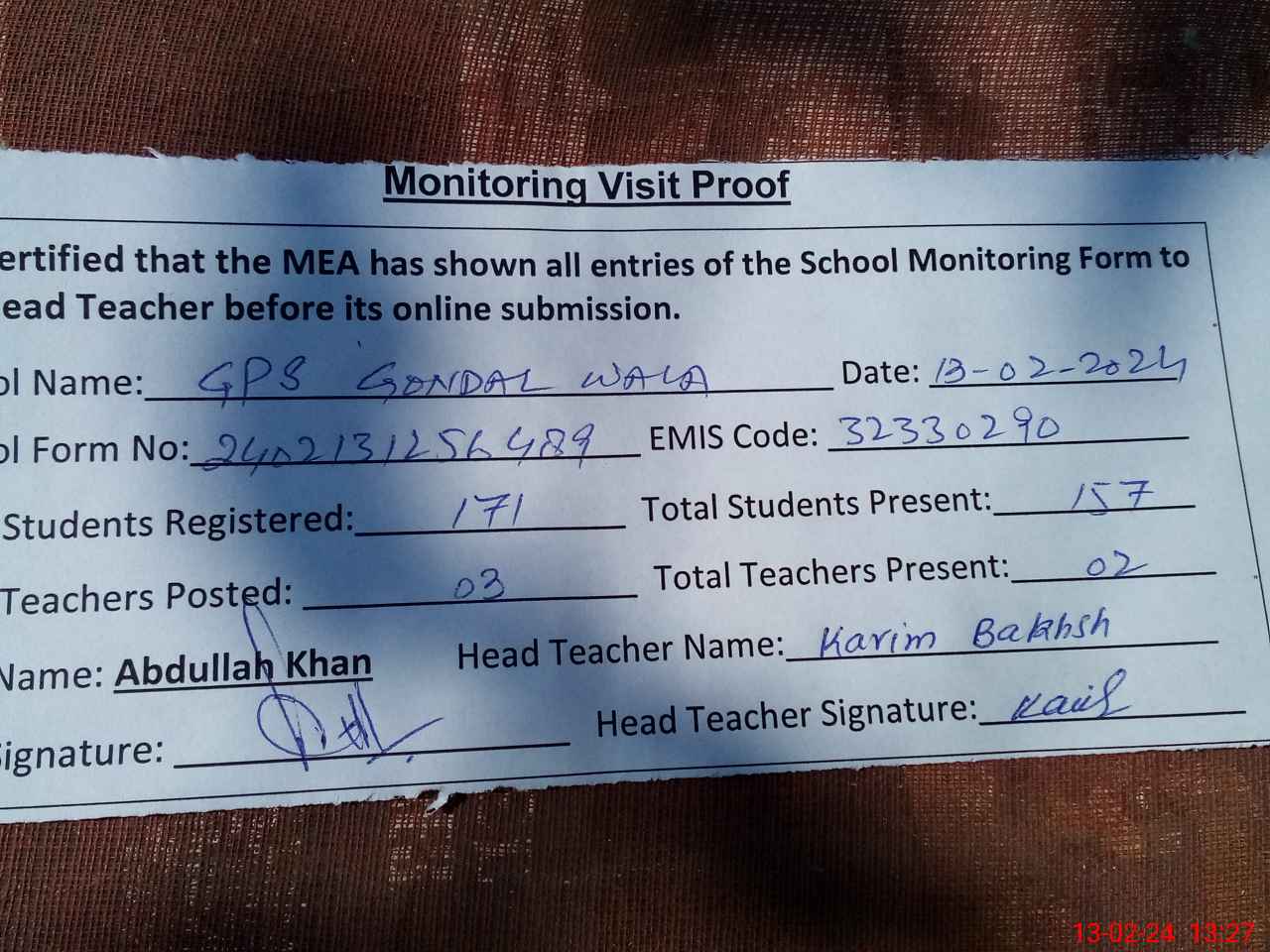 | Attendance Register | Head Teacher | MEA with School | Visit Proof |