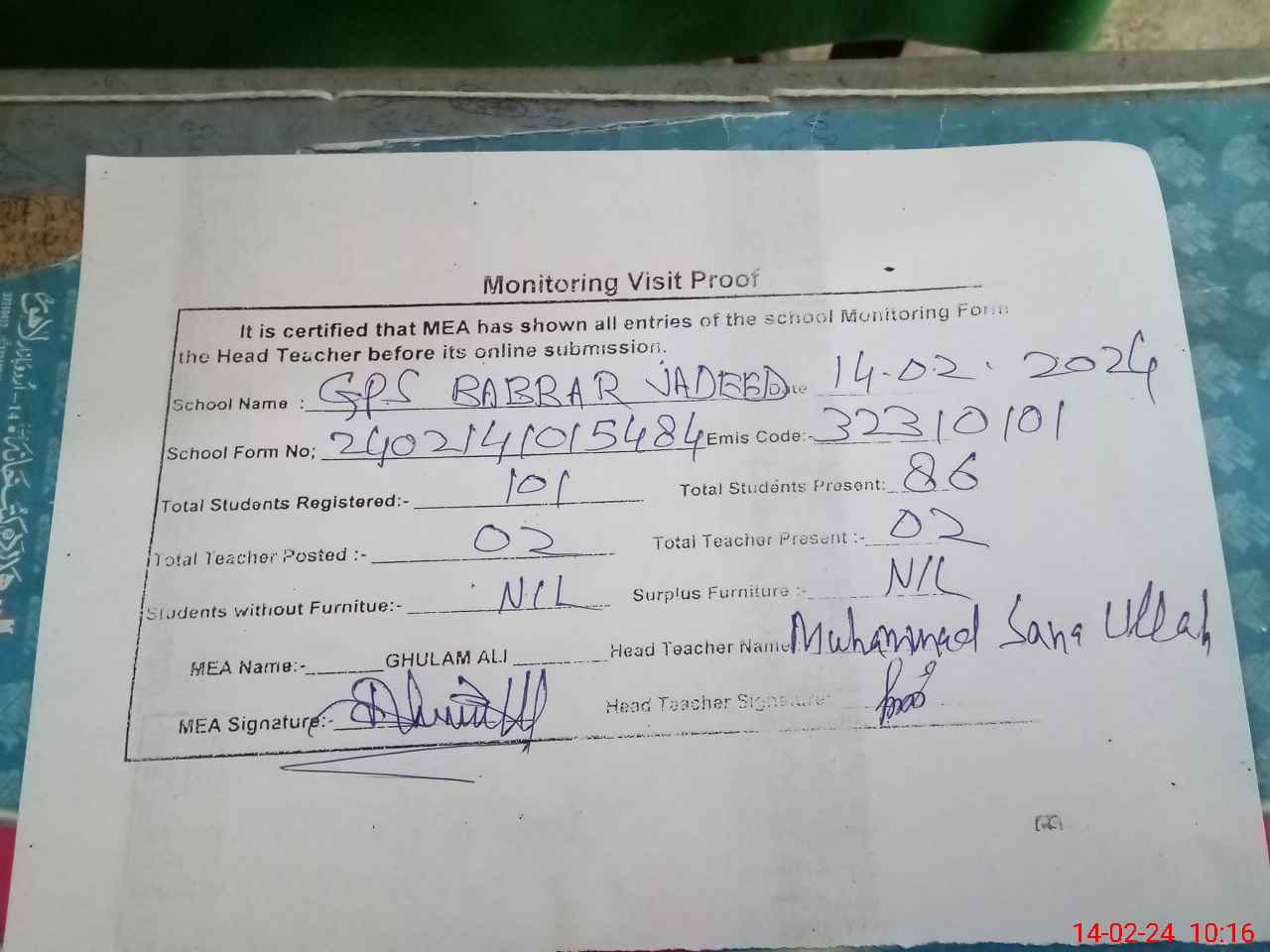 | EMIS Code: 32310103 | Name of School: GPS BABBER JADEED | |||