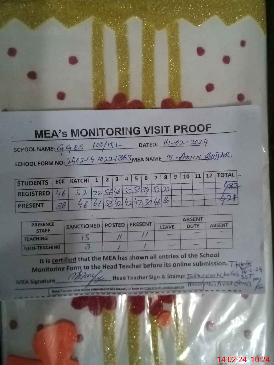 | EMIS Code: 36430100 | Name of School: GGES 100/15-L, MIAN CHANNU | |||
