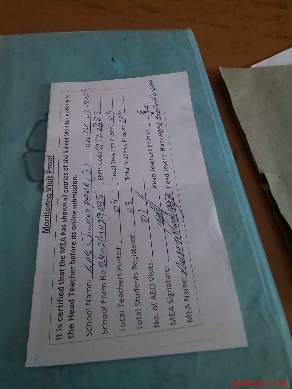 | Attendance Register | Head Teacher | MEA with School | Visit Proof |