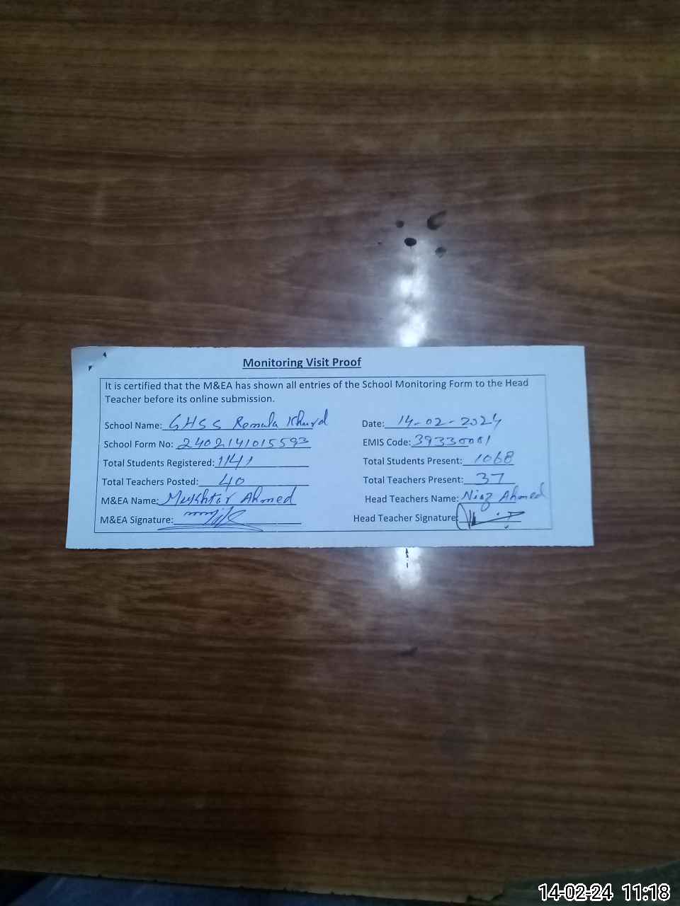 | Attendance Register | Head Teacher | MEA with School | Visit Proof |