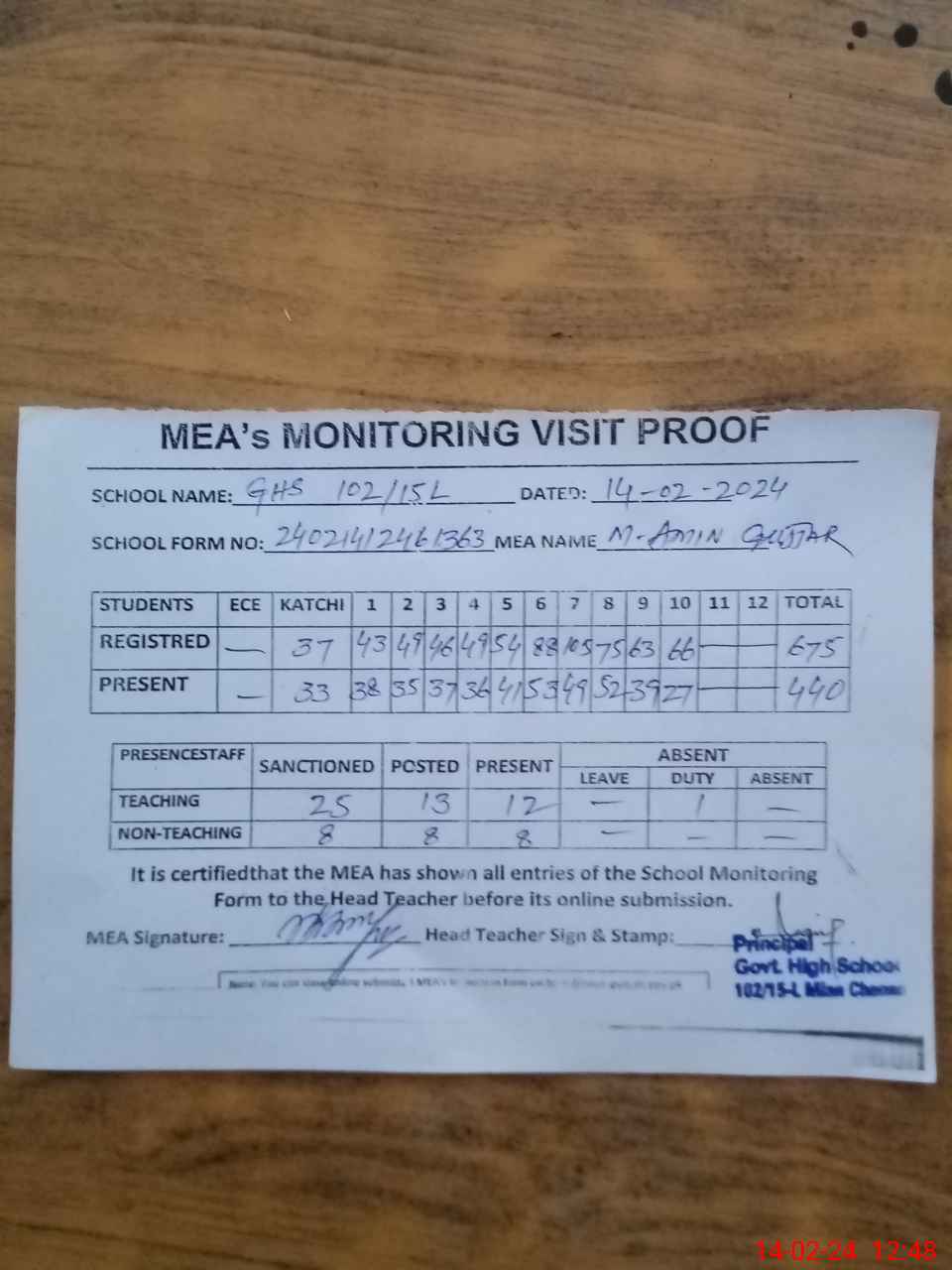 | Certified that this School was Inspected by the Undersigned MEA/DMO Today and the Information Stated Above is as Per Record. | |||||