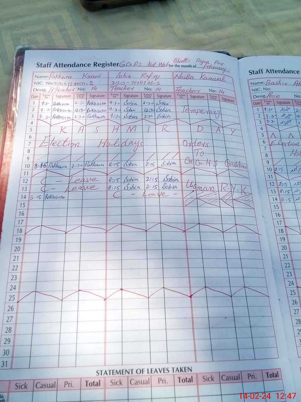 | CNIC | Full Name | Designation | R/C | Absence During Last Calender Month |