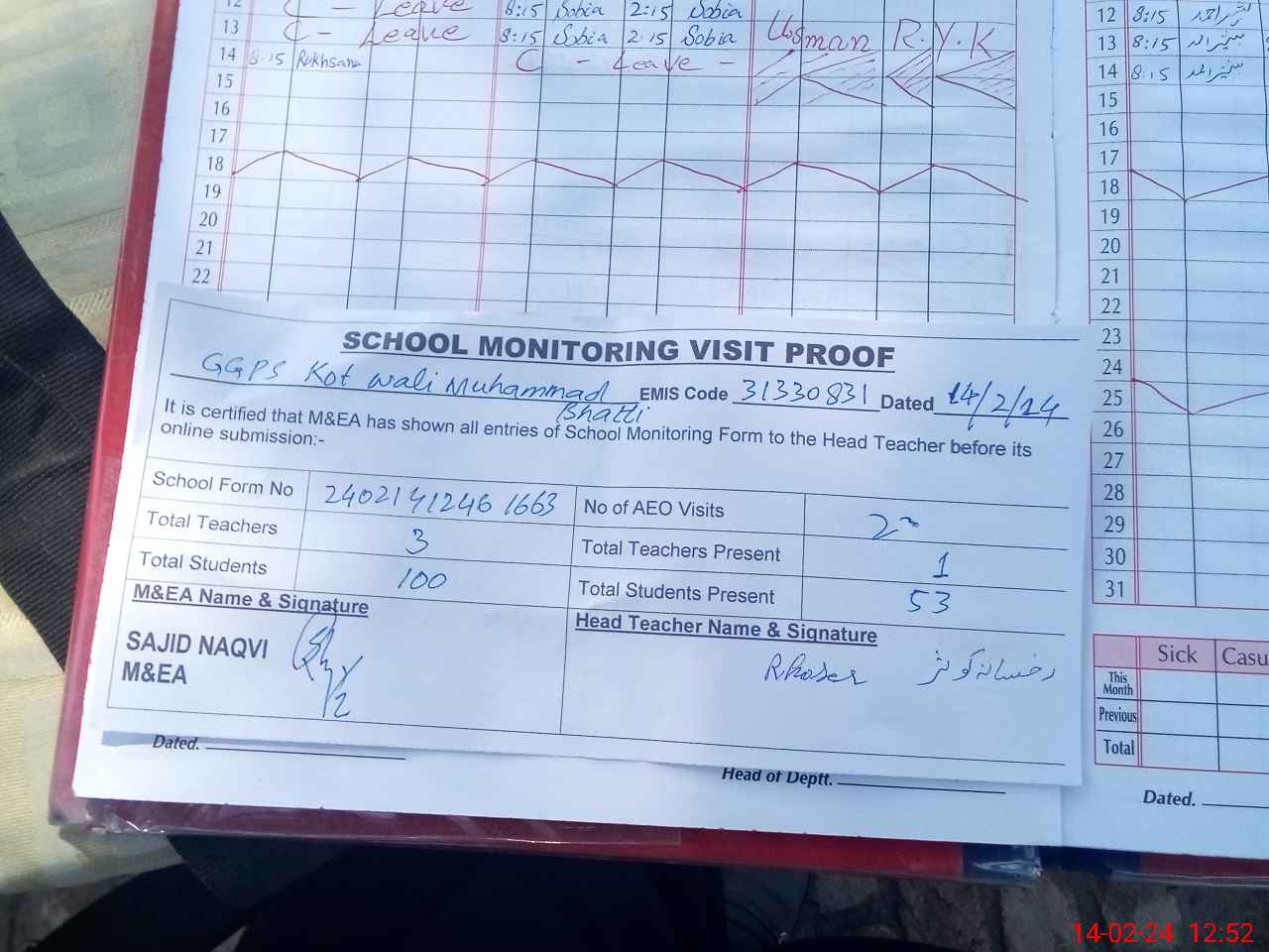 | Attendance Register | Head Teacher | MEA with School | Visit Proof |