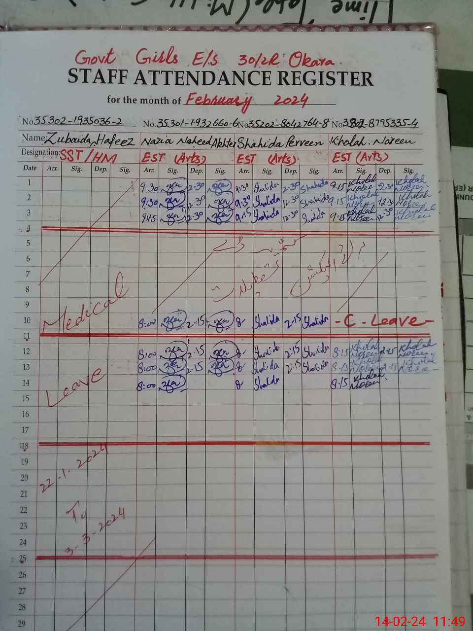 | CNIC | Full Name | Designation | R/C | Absence During Last Calender Month |
