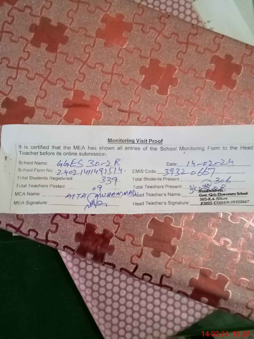 | EMIS Code: 39320667 | Name of School: GGES CHAK NO.30/2-RA | |||