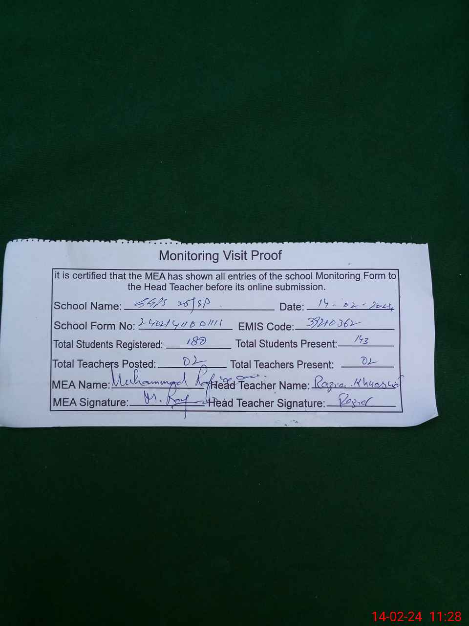 | Certified that this School was Inspected by the Undersigned MEA/DMO Today and the Information Stated Above is as Per Record. | |||||