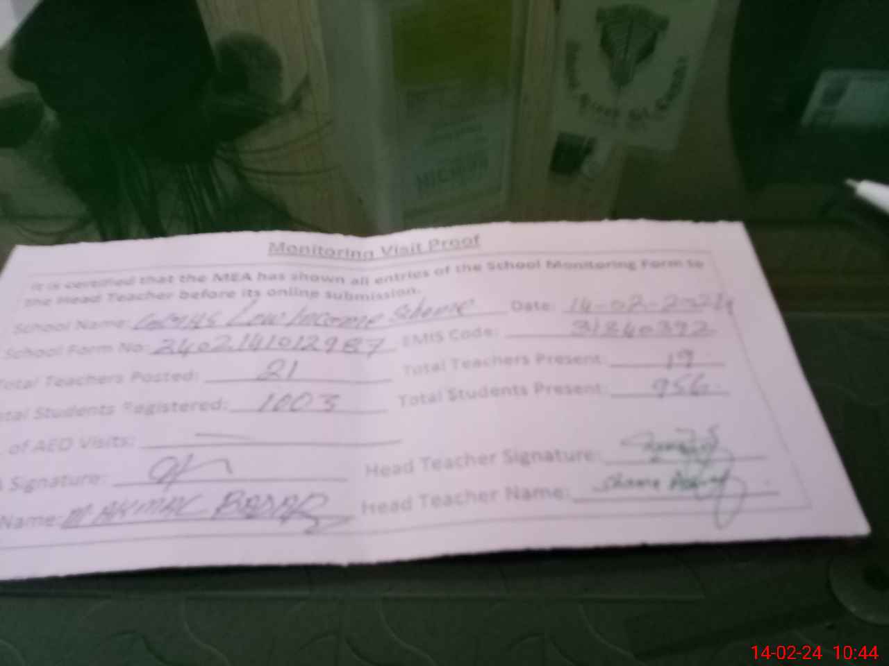 | Attendance Register | Head Teacher | MEA with School | Visit Proof |