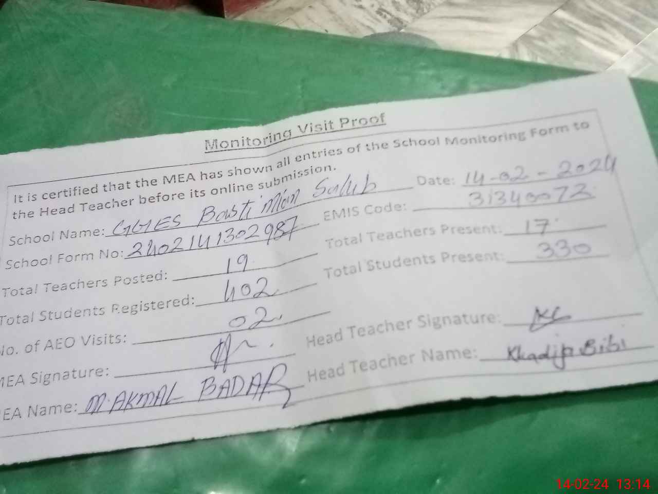 | Attendance Register | Head Teacher | MEA with School | Visit Proof |