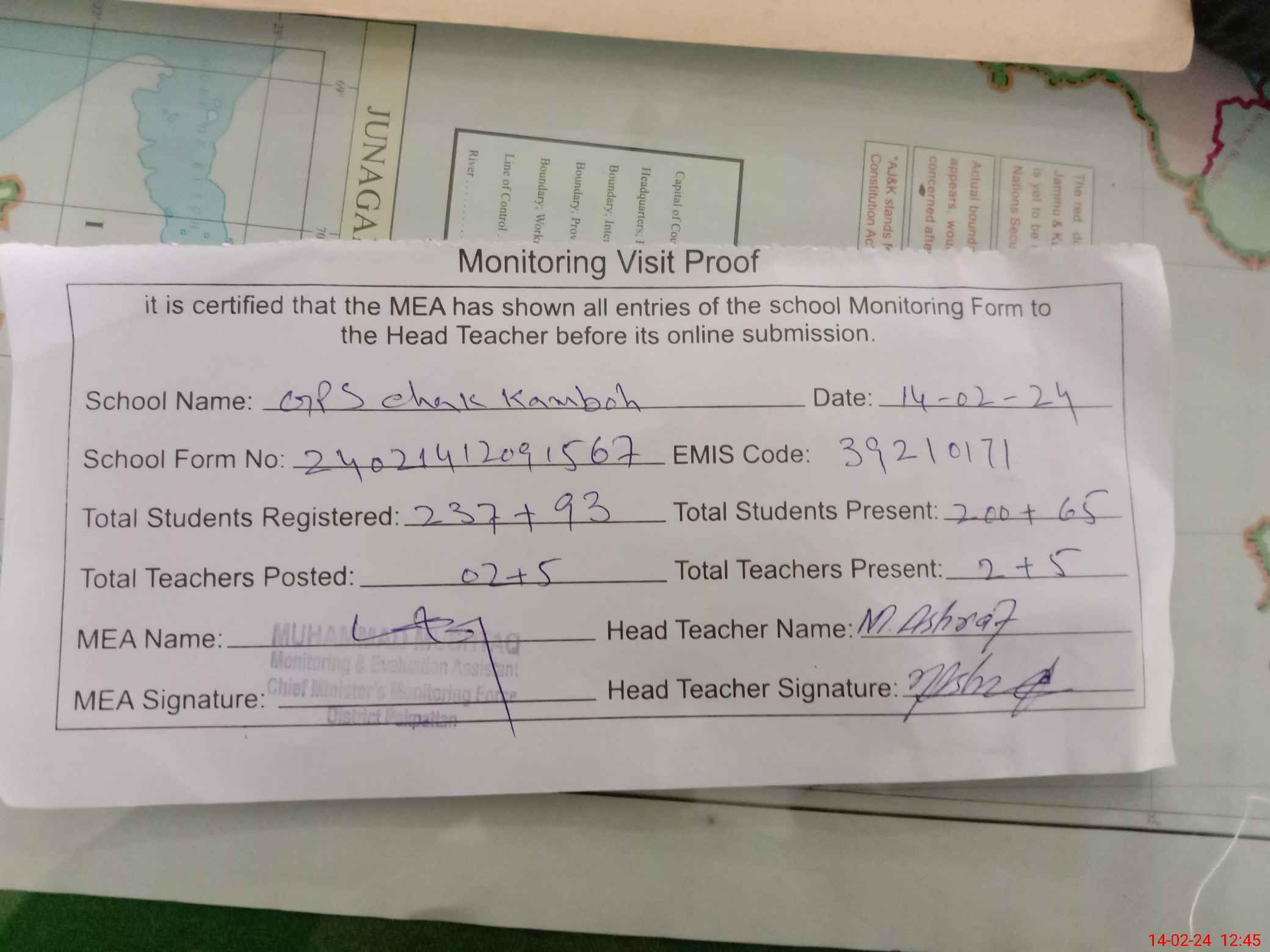 | Attendance Register | Head Teacher | MEA with School | Visit Proof |