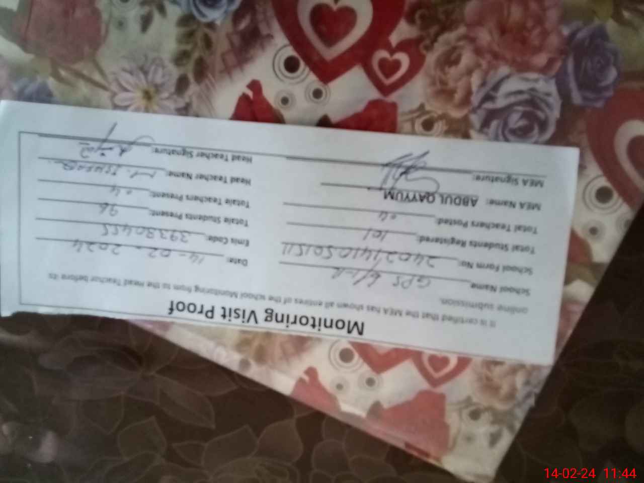 | Attendance Register | Head Teacher | MEA with School | Visit Proof |