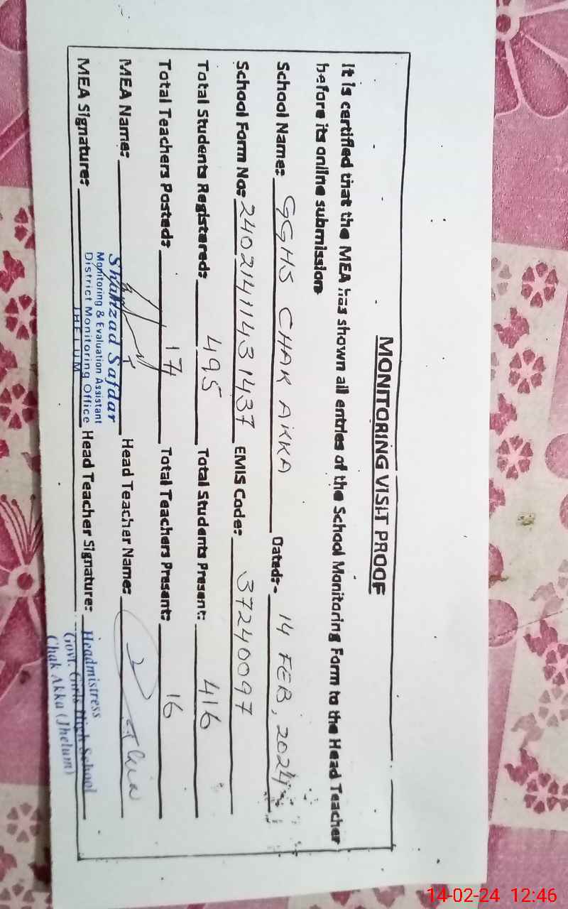 | EMIS Code: 37240097 | Name of School: GGHS CHAK AKKA | |||