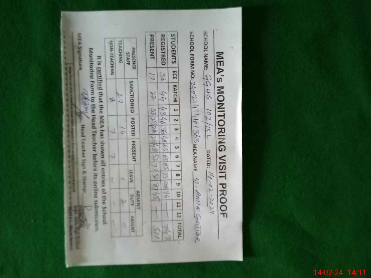 | Attendance Register | Head Teacher | MEA with School | Visit Proof |