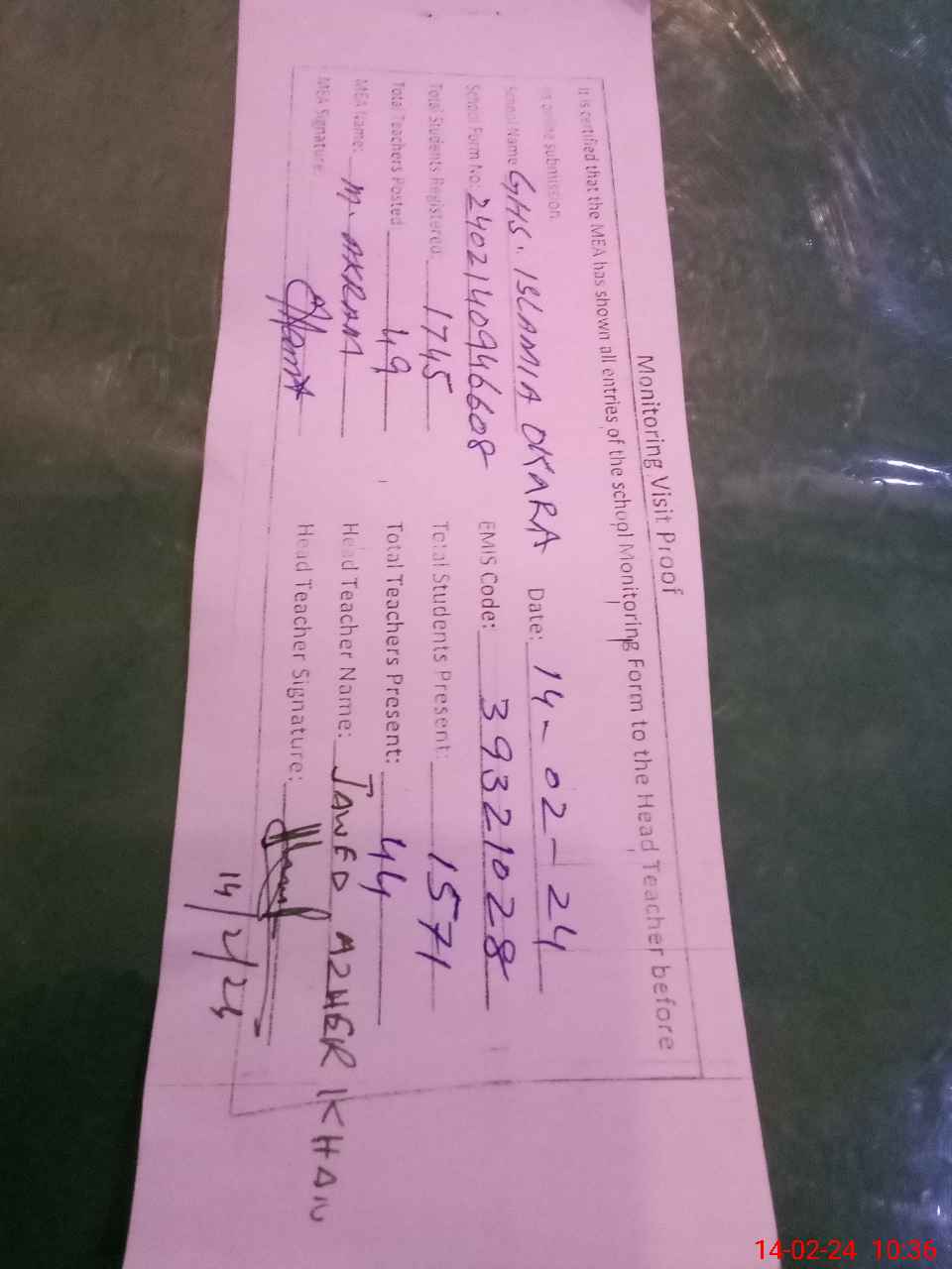 | EMIS Code: 39321028 | Name of School: GHS ISLAMIA OKARA CITY | |||