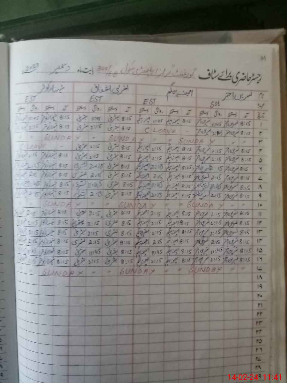 | CNIC | Full Name | Designation | R/C | Absence During Last Calender Month |