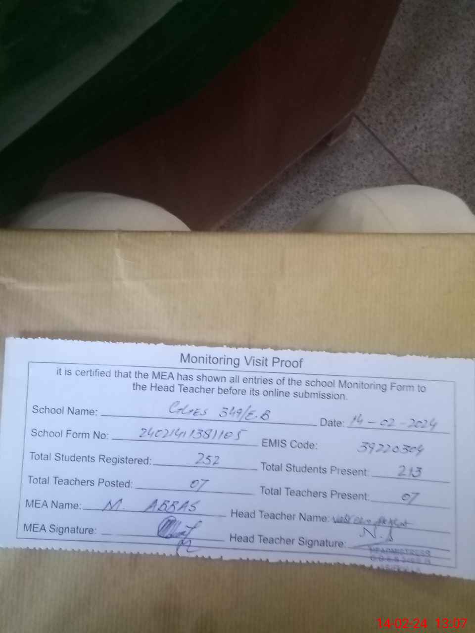 | Attendance Register | Head Teacher | MEA with School | Visit Proof |