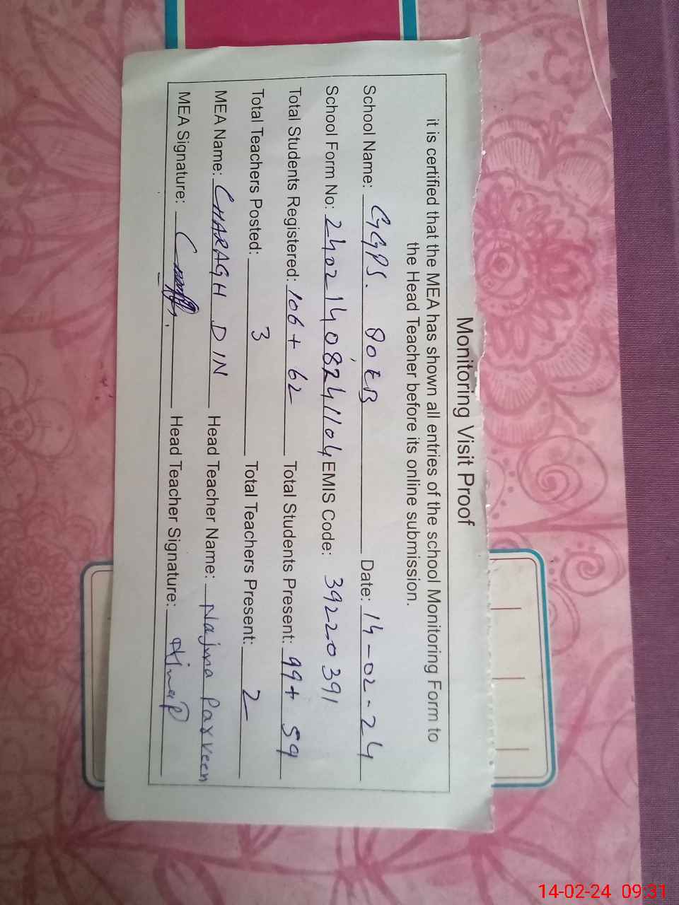 | Attendance Register | Head Teacher | MEA with School | Visit Proof |