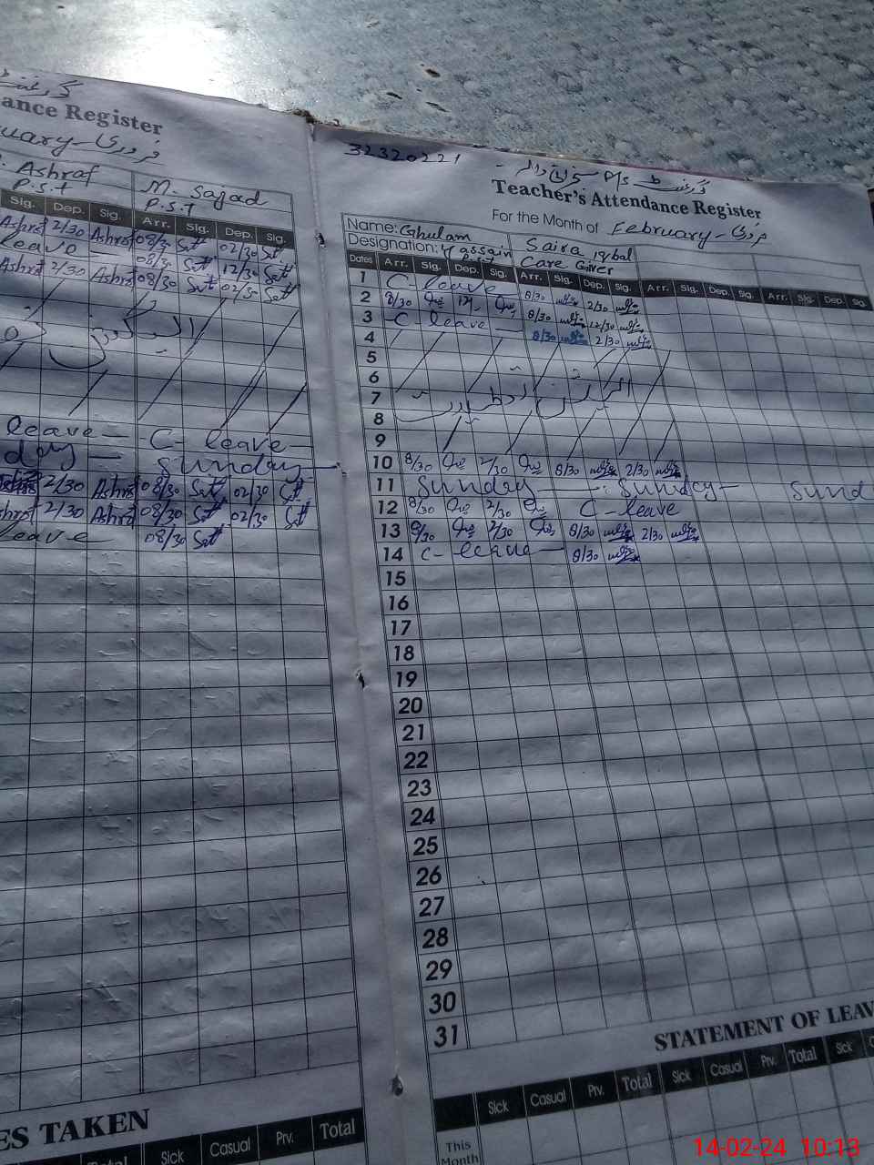 | CNIC | Full Name | Designation | R/C | Absence During Last Calender Month |