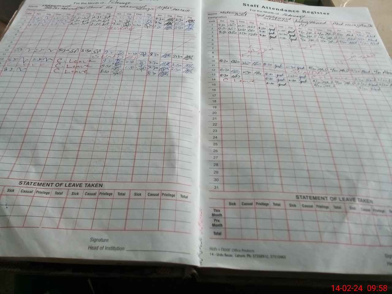 | CNIC | Full Name | Designation | R/C | Absence During Last Calender Month |