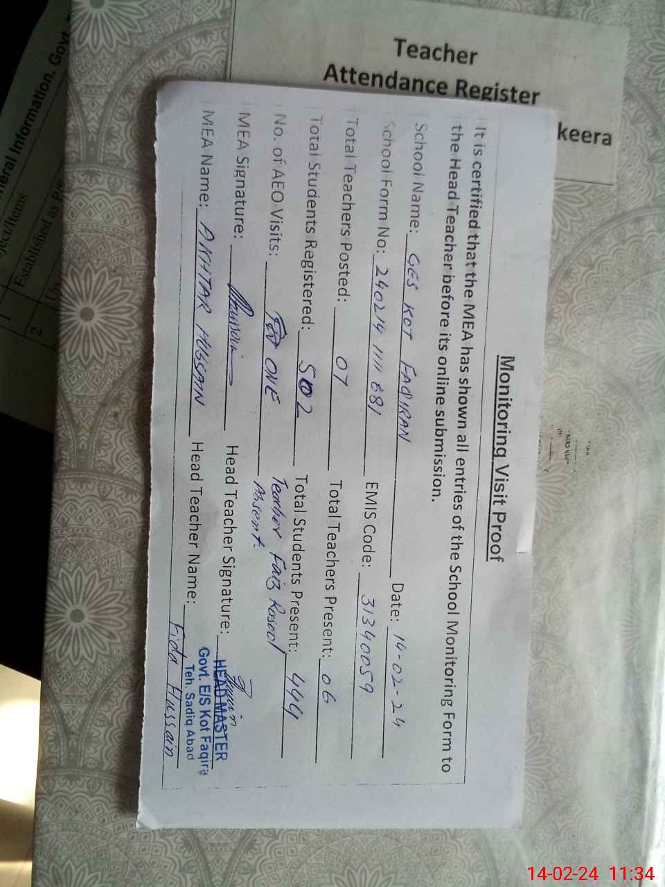 | Attendance Register | Head Teacher | MEA with School | Visit Proof |