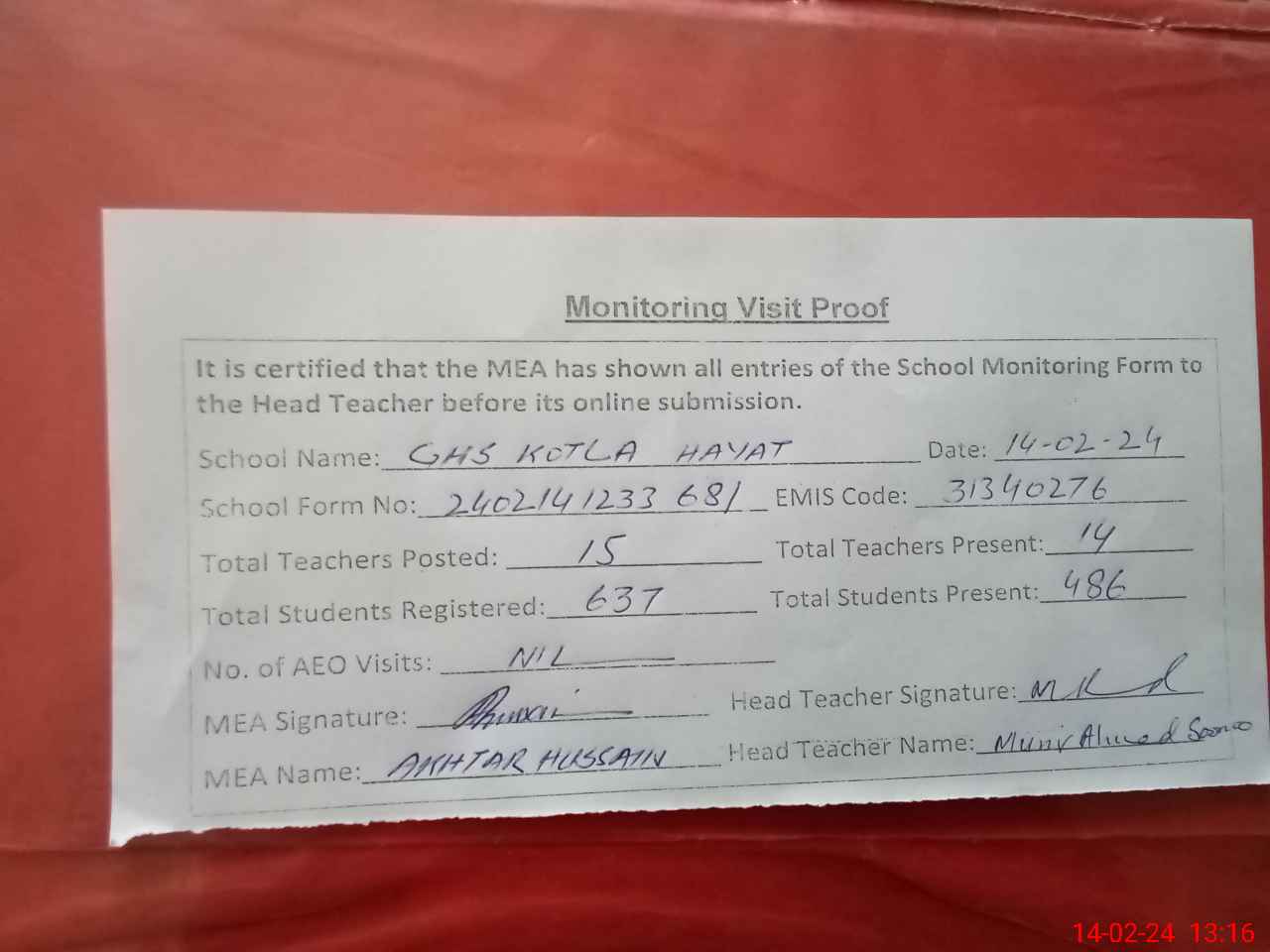 | Attendance Register | Head Teacher | MEA with School | Visit Proof |